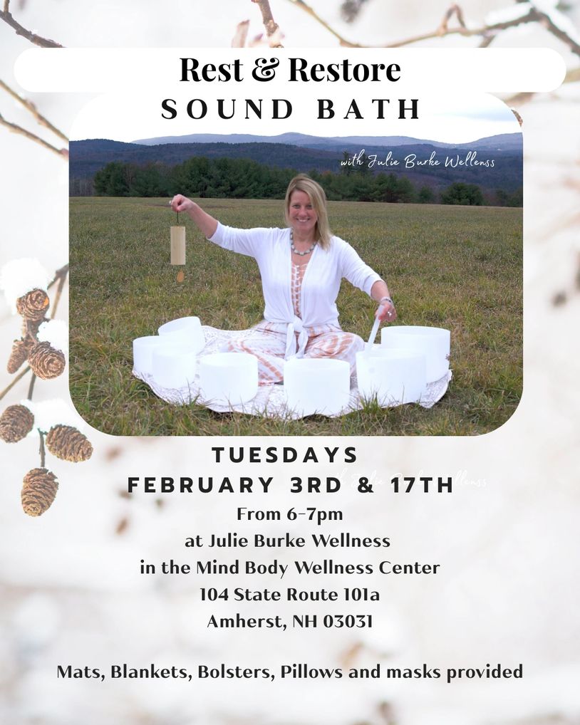 The Rest and Restore monthly (February 3rd, and February 17th) Sound Bath is a gentle, space to unwind from your busy day, drop into calm, and nourish your nervous system through sound and stillness.